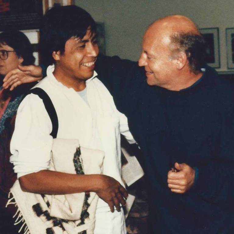 Julio E. Batres, founder of la Pedrera Community Project talking with writer Eduardo Galeano.